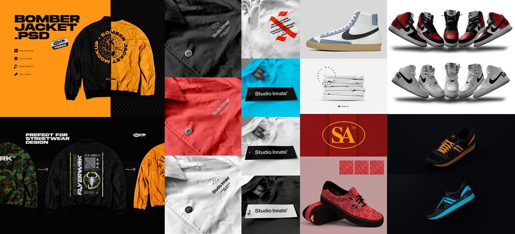 ► Branding Clothes Elements by Studioinnate + Bomber Jacket Photoshop Mockup by Flyerwrk + Folded Fabric Stack Mockups by Freeject + Vans Era Mockup by Marcogava + Nike Air Force One Shoe Mockup by Dirtydesigns + Shoe Sneakers Mockups by NaumanAltaf ( Free )